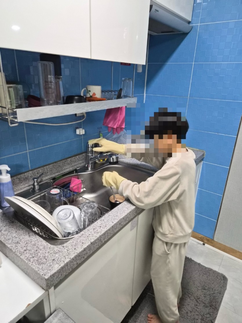스스로 설거지를 하며 뿌듯한 미소를 보입니다.