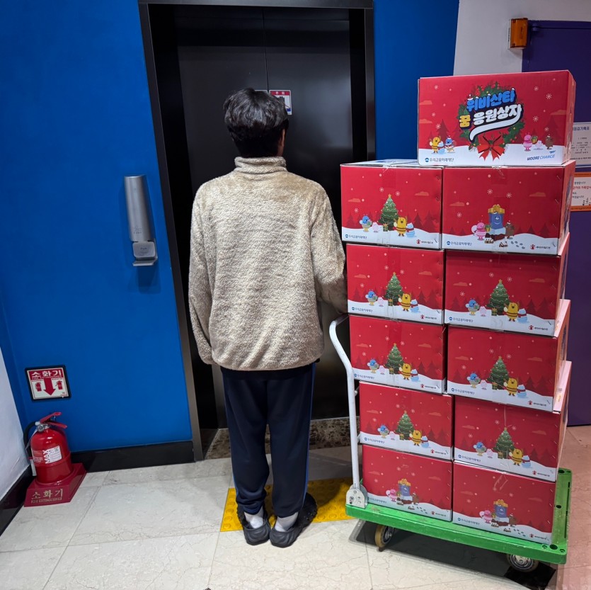 아동에게 고마움을 표현하며 함께 짐을 옮기며 따뜻한 크리스마스 이브를 보내며 선물을 무사히 전달했습니다.