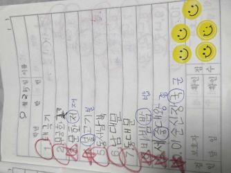 내년 초등학교에 입학하는 막내가 어린이집에서 받아쓰기를 받아 왔네요. 틀린 글자들이 귀엽기도 하고 꾹꾹 눌러 쓴 단어들이 대견해 보이기도 합니다. 내심 한글을 못 떼면 어쩌나 걱정하고 있었는데 제법 반듯반듯해진 글자들을 보니 조금은 마음을 놓이게 하네요!! 요즘 들어 외출할 때 스스로 간판에 써 있는 글자들을 읽기도 하고 그림책을 띄엄띄엄 읽는 모습도 보이네요. 밝게 웃고 있는 스티커가 다섯 개 붙어 있는 걸 보면 아무튼 점수는 50점인가 봅니다^^
