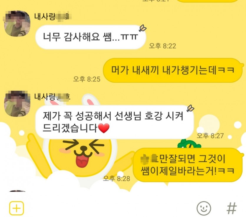 꼭 호강시겨죠!!! 페이지 정보 작성자 김선미 댓글 0건 조회 3,479회 작성일 19-08-26 00:37 목록 본문 아직도 한여름 같은 날씨에 더위를 유독 많이 타는 승○에게 찗은편지와 함께 시원한 음료수 사 먹으라며 용돈을 주었습니다. 잠시 후 방에 들어 간 승○에게 메세지가 왔습니다.감사하며...호강시켜 드리겠다고... 문자를 받고서 답장을 했습니다.승○가 잘되는게 선생님이 바라는 것이라고... 승○야!!! 좋은사람으로 성공해서 꼭 약속지켜서 선생님 호강시켜줘!!! 이전글청소 돕고싶어요! 19.08.27 다음글박물관 견학 19.08.25 댓글 0 댓글목록 등록된 댓글이 없습니다.