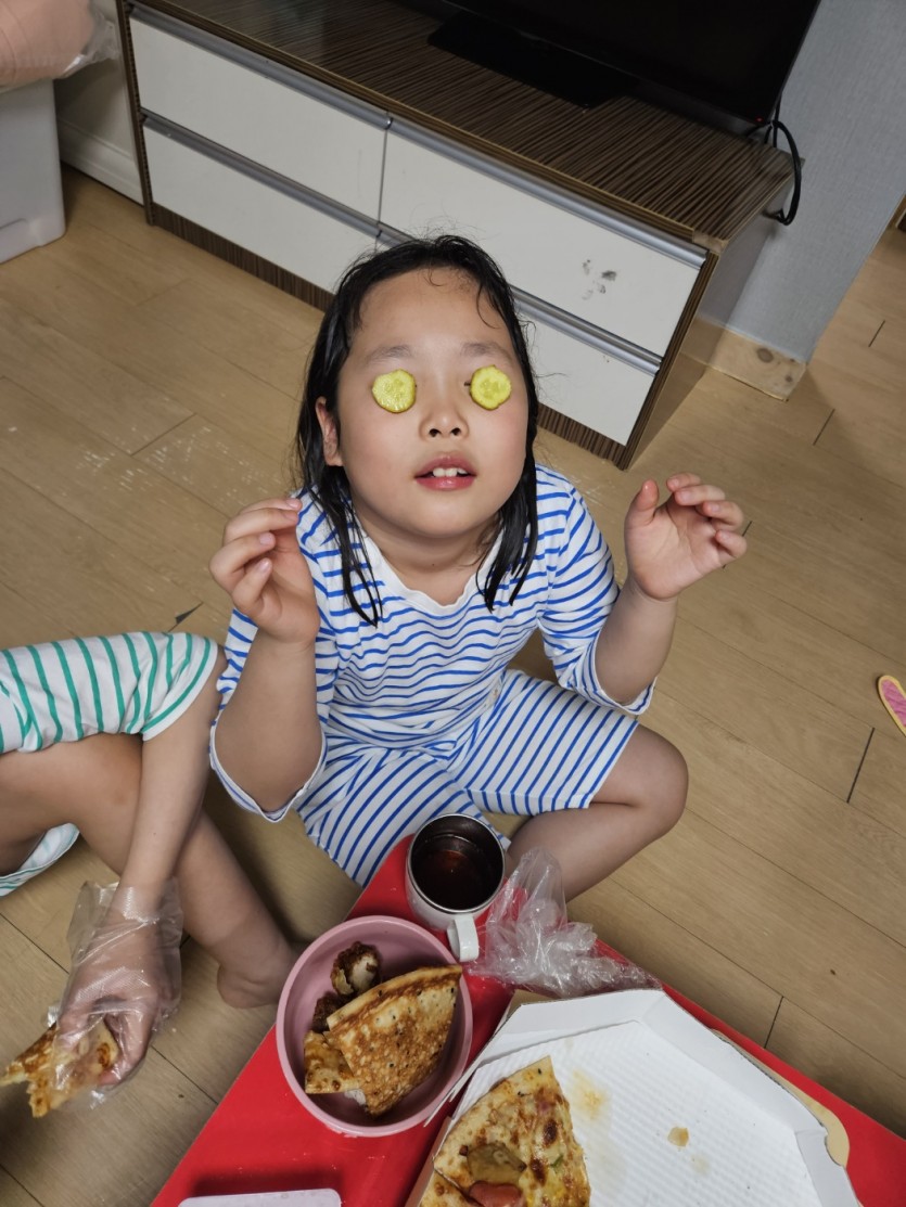한참 맛있게 치킨과 피자를 먹던 중 이0진 아동이 보육사를 부르더니 ‘선생님~ 이거 보세요!!’라면서 피클을 눈에 대더니 사진을 찍어 달라고 합니다.