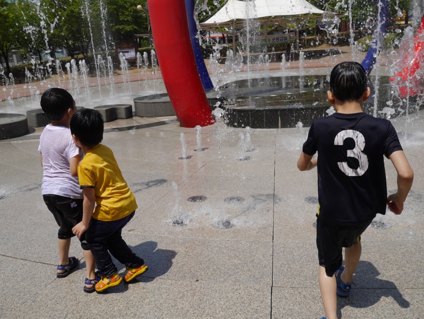 텐트에 있던 아이들은 마치 발사되듯 분수로 달려가 '꺄아악! 꺄악!' 소리 지르며 물놀이를 하기 시작했습니다.